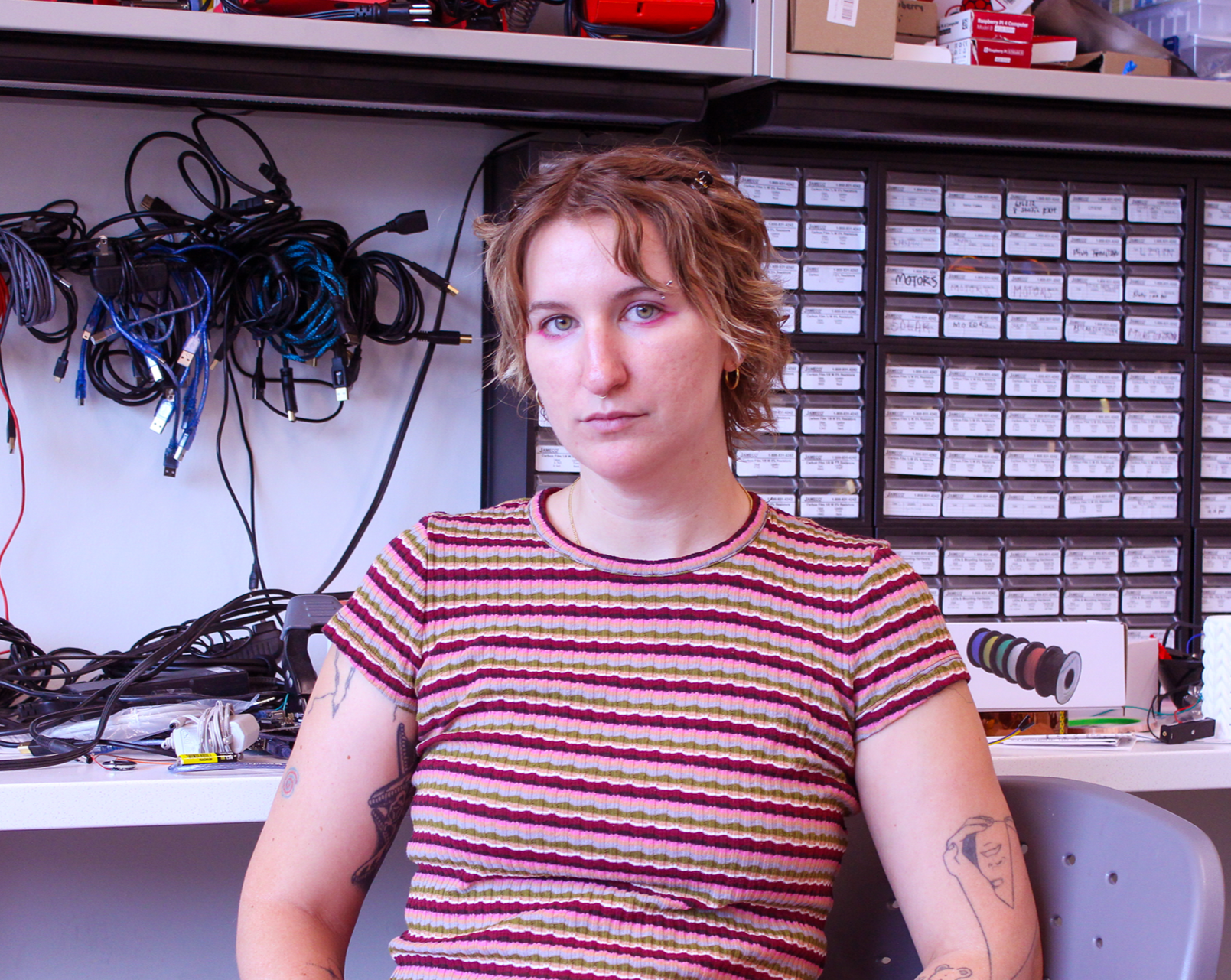 In their creative practice, Tardie combines a variety of digital and manual fabrication methods to create objects, installations, and performances that explore the cultural lineages of machines. Their interest in machines started at a very young age: Tardie grew up in a small family business in print manufacturing and spent their childhood around manufacturing equipment. Industrial machinery has long acted as a substrate through which their family connects and communicates. They currently manage a makerspace and work with digital fabrication machines every day. The sounds, maintenance, and operation of machines form the primary landscape of their work.
