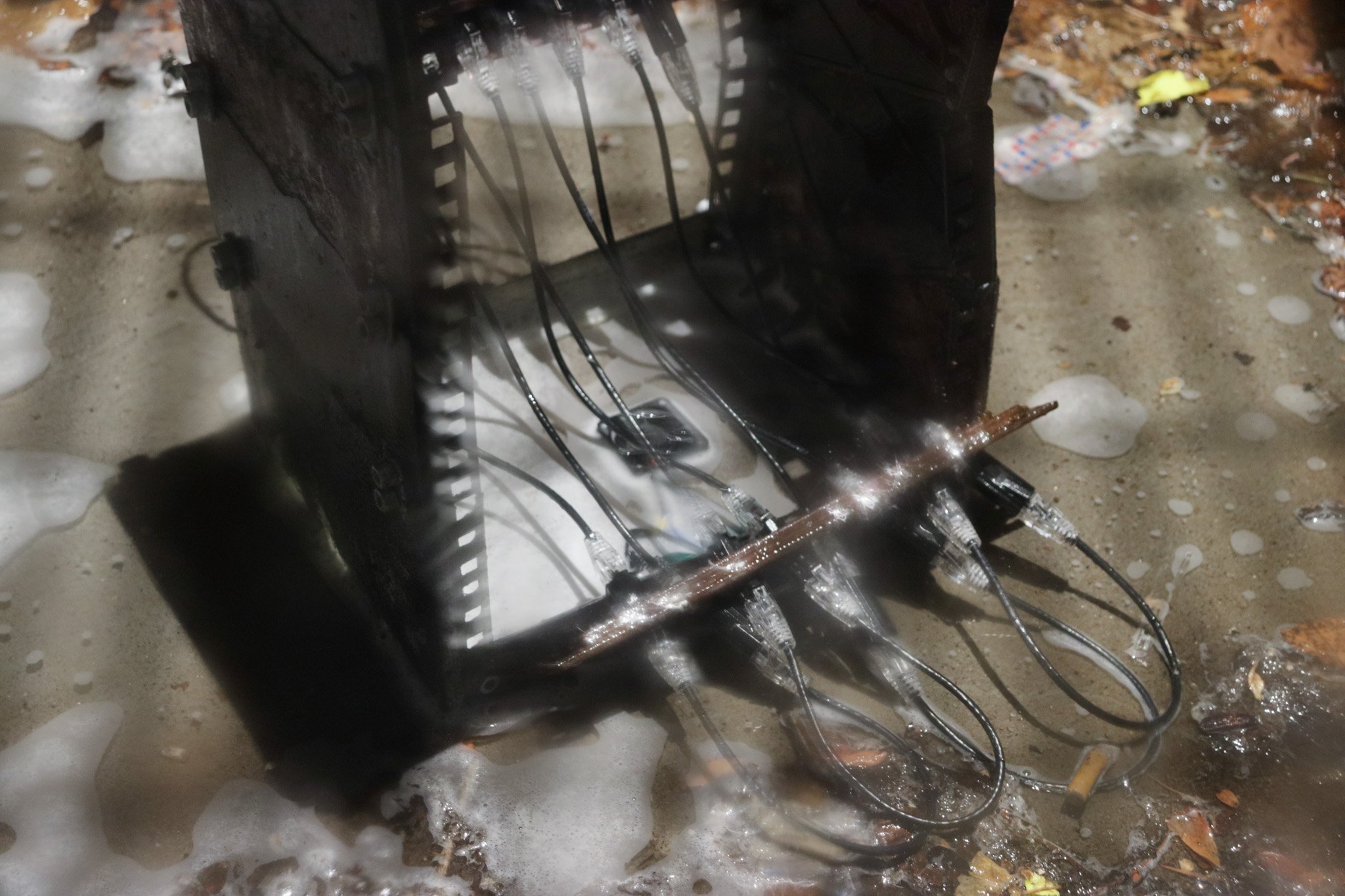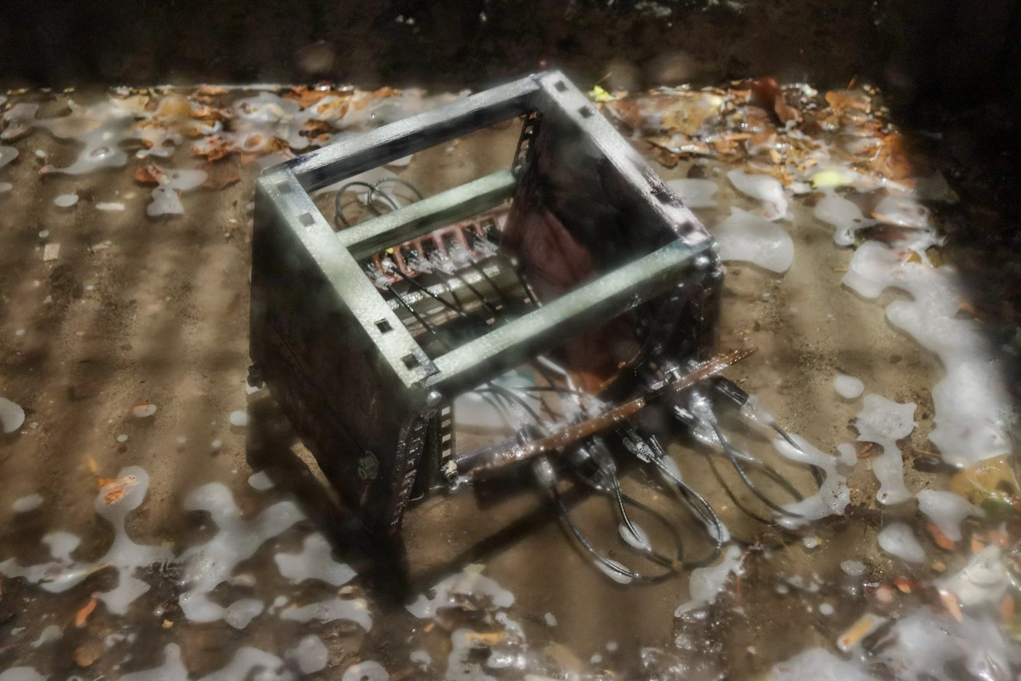 Cooling Infrastructure, 2026. Polyvinyl alcohol filament, alcohol ink, ethernet patch cables, dc fan, photovoltaic cell, polylactic acid.